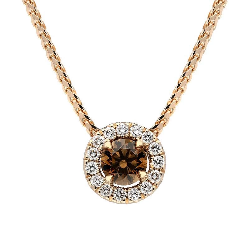 Simple and elegant, this round cluster pendant features a central brown diamond of 0.33cts with a halo of sparkling white diamonds totalling 0.10cts. Beautifully crafted in 18ct rose gold and sold complete with an 18 inch long 18ct rose gold chain.Â