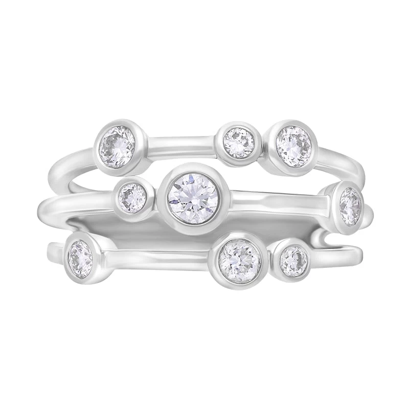 An embodiment of luxurious style, this 18ct white gold bubble ring showcases three rows of brilliant cut diamonds of varying sizes which have been bezel set to give a simple, contemporary finish. Total diamond carat weight of nine diamonds is 0.54cts. Â