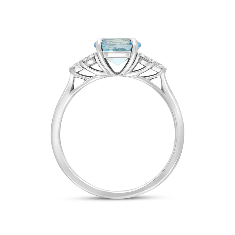 A feminine 18ct white gold ring featuring a stunning 1.10ct round cut Aquamarine at its heart. Six brilliant cut diamonds (0.30ct total), sit elegantly either side of the Aquamarine. The beautiful precious gemstones make a dazzling display of light and colour. The overall effect is opulent and luxurious.Â