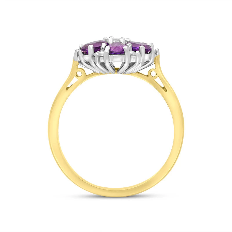 An embodiment of elegance and luxury, this stunning 18ct yellow gold ring features a central cluster of oval cut amethysts (0.96ct), accented by seven round brilliant cut diamonds (0.15ct, 0.09ct, total diamonds 0.24ct). Designed perfectly for everyday wear, this amethyst and diamond set piece would make the perfect engagement or dress ring.