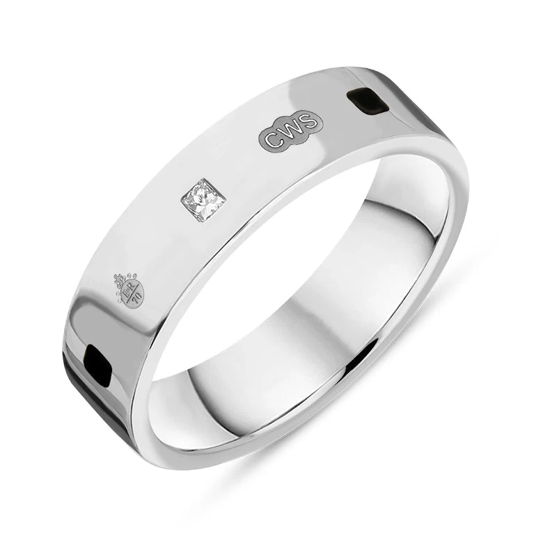 9ct White Gold Whitby Jet Diamond Queen’s Jubilee Hallmark Princess Cut 5mm Ring, R1199_5_JFH