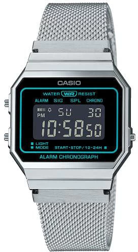 Casio Watch Classic Unisex A700WEMS-1BEF. A classic CASIO design, this timepiece is inspired by the mood of space and science fiction. Combining a black dial with blue metallic vapour deposition, it expresses a retro-futuristic view of the world. Featuring a digital display, a daily alarm and a stopwatch. It also has functions useful in daily life, such as a stopwatch and time alarm. Resistant to minor splashing and has a silver case and band.
