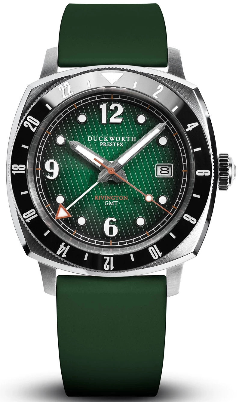 Duckworth Prestex Watch Rivington GMT Green Fume Green Rubber D489-04-ER. The retro cushion-style case is constructed out of durable 316L brushed stainless steel. The Rivington is water resistant to 200m. The green fume dial and distinctive waffle pattern distinguishes the Rivington, whilst the contrasting orange second hand and hour markers add a pop of colour to animate the look.