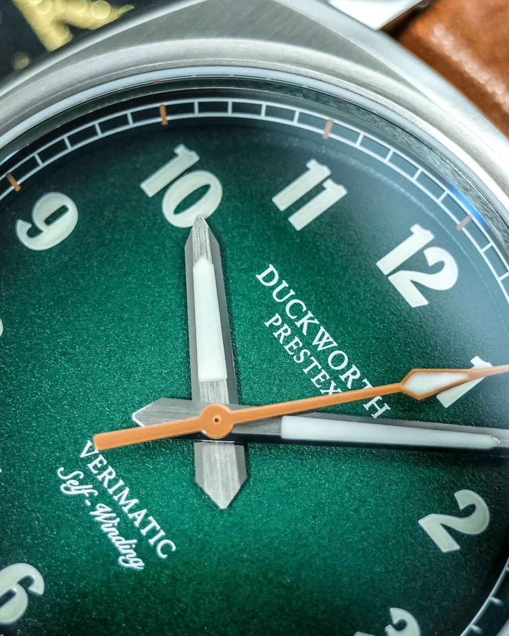 Duckworth Prestex Watch Verimatic Green Fume Brown Suede D891-04-F. The Duckworth Prestex Verimatic combines the elegance of a cushion case and outer railroad track with a stunning textured Green Fume dial, bold Arabic numerals and contrasting orange seconds hand. It all comes together to deliver a more relaxed vibe with a classical twist, making this a watch suitable for any occasion.