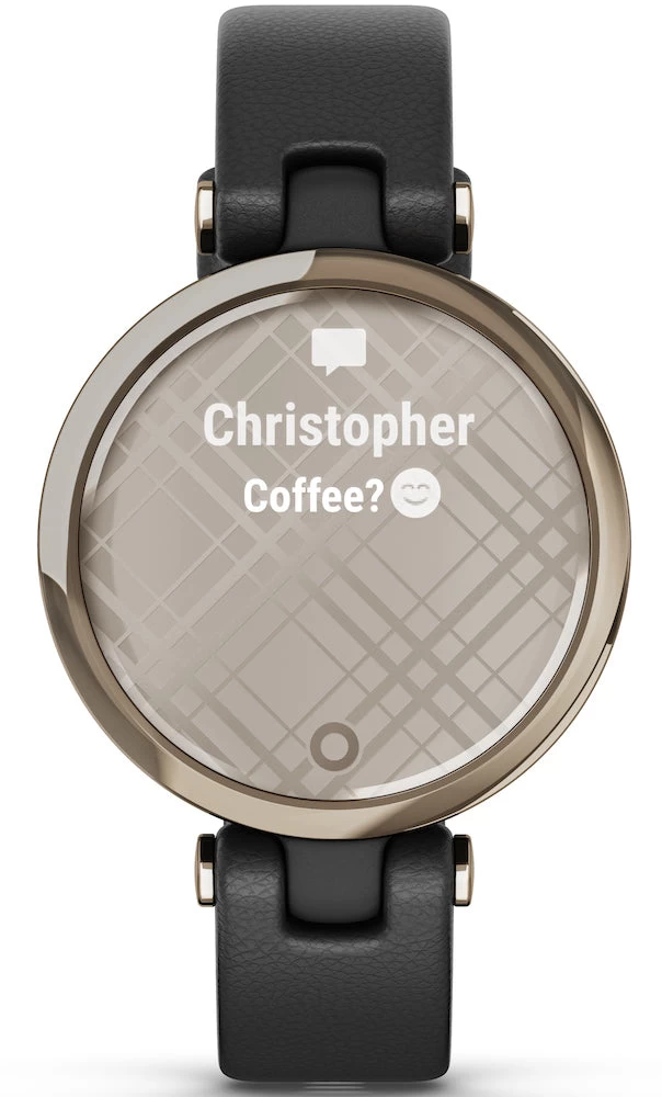 Small and mighty, the Garmin Lily is the brand’s first ever female-exclusive smartwatch range boasting stylish 34mm case designs, interchangeable strap options and an exclusive pattern lens. This Garmin Lily watch is beautifully dressed in a light cream gold and black case and fitted with a luxurious matching black Italian leather band. Its monochromatic LCD display also supports the glamourous design with a unique patterned lens which fades to reveal the bright touchscreen display with just a tap or twist of the wrist.