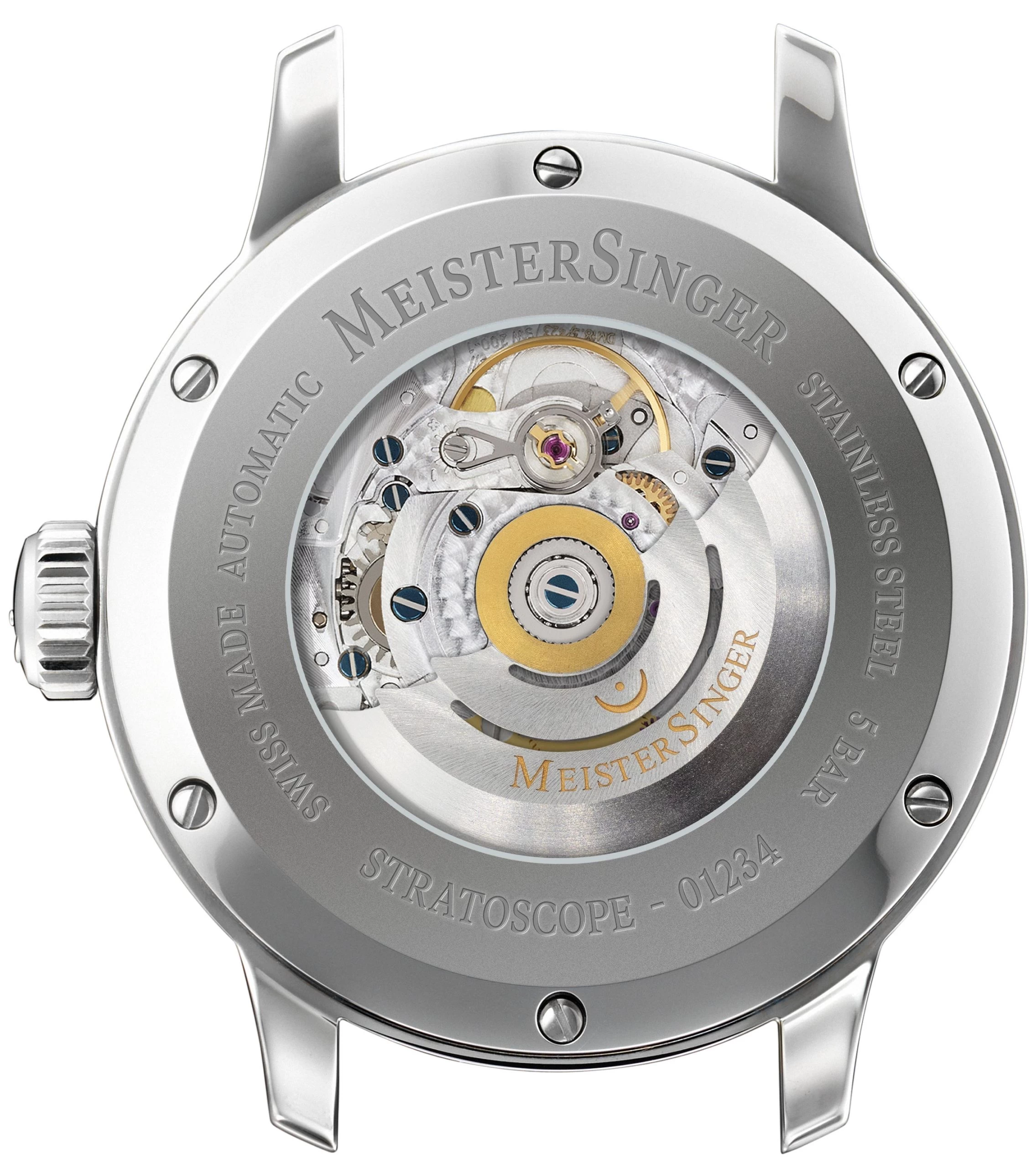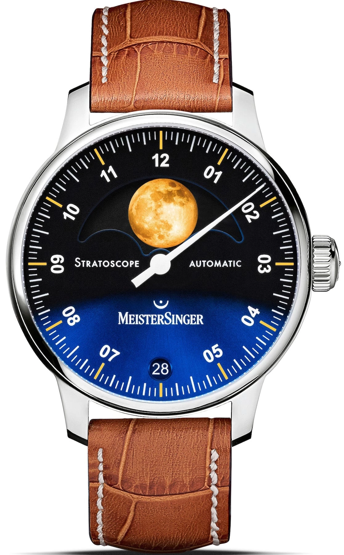 MeisterSinger Watch Stratoscope Golden Moon ST982G – SG03. Of all the masterpieces MeisterSinger has produced in recent years, the Stratoscope is undoubtedly among the most impressive. Its soft transition from sunburst blue to black portrays the night sky, while in the upper third, the photorealistic, almost three dimensional moon majestically orbits the Earth. The popular moon phase watch in a 43mm case is now presented in a second version with a golden moon and matching golden hour markers.