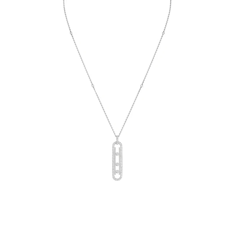 This is a love story more than a decade in the making. The Move design has enchanted many women, becoming the go-to piece they choose to wear every day. The Move 10th PM white gold diamond necklace celebrates the most powerful elements of the iconic luxury jewelry collection. Crafted vertically, the mobile Move diamonds appear to be floating, as if by magic. You will love its sliding diamond chain, which makes it possible to wear this diamond necklace for women shorter or longer, as you wish. A true chameleon, this white gold diamond necklace will add the perfect touch to any look – be it urban chic, glamorous or casual. Total diamond: 0.74ct (G,VS). Length: 80cm (adjustable sliding chain). Length of pattern: 40mm. Width of pattern: 9mm.