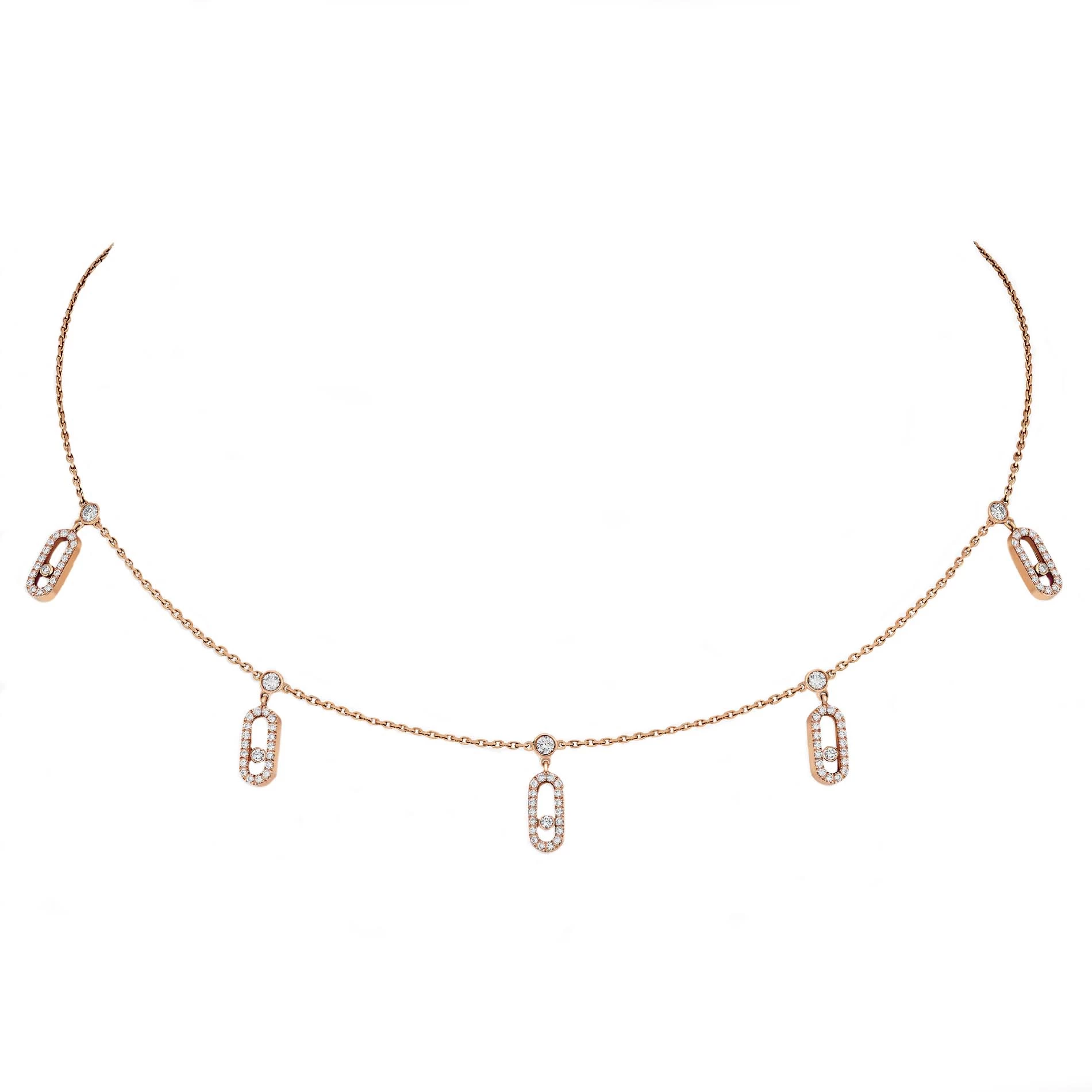 Give into temptation with the Move Uno drop pendant diamond necklace in rose gold. It is made of 18ct rose gold and consists of a fine chain bearing five radiant Move Uno diamond charms. An ode to the light and radiance of diamonds, its suppleness and the movement that defines it is irresistible. Featuring a carabiner clasp with sliding system, you can wear it as a choker or choker necklace. Total diamond weight: 0.61ct, G/VS quality. Length of motifs: 9.7 mm. Width of motifs: 4.5 cm.