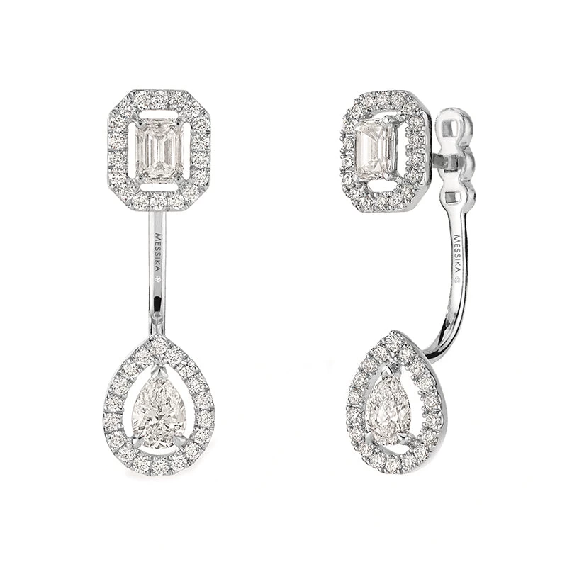 In line with the trendy ear jewels for women, these My Twin Toi & Moi 0.15ct pave earring in white gold are perfect to mark a precious moment of life or an engagement. The luminescent white gold enlightens the diamonds purity, enhancing their beautiful radiance. On each white gold diamond earring, the drop motif with the pear cut 0.15ct diamond sets behind the ear just below the lobe. You can adjust the height of this part or just wear the stud earring with the emerald cut 0.15ct diamond. Wear them in pair or in asymmetry for a fashionable style. Central stones: 0.15ct each (F, VS). Total diamond: 0.90ct (FG,VS). 4 notches. Maximum length: 22mm. Minimum length: 16mm.