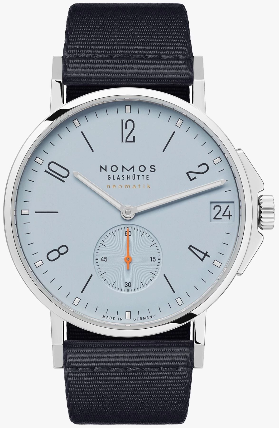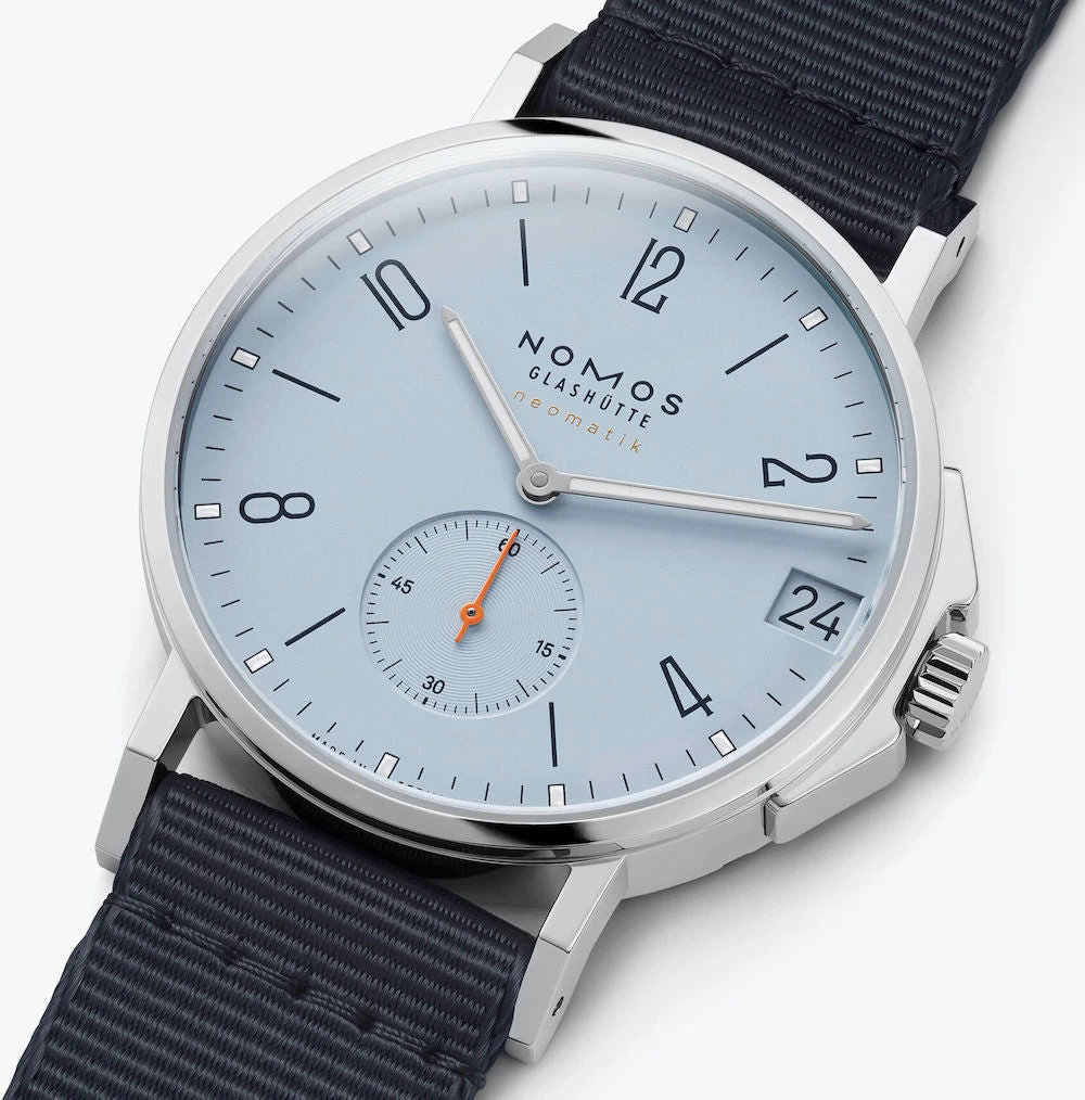 Nomos Glashutte Watch Ahoi Neomatik 38 Date Sky Sapphire Crystal 526. Take the feeling of freedom with you, wherever you go, in the colours of a bright blue sky and shimmering golden sands. Your watch is a constant companion: in the office, at the beach, during the evenings spent on a rooftop terrace, from day to night. And with modern German design, it suits every occasion.