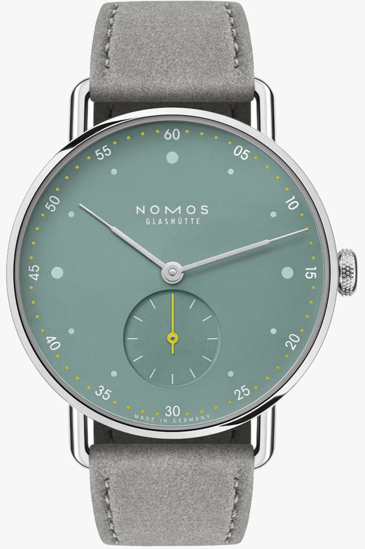 Nomos Glashutte Watch Metro 33 Sage Sapphire Crystal 1124. Metro 33 reflects a metropolitan attitude to life. The Alpha movement by NOMOS Glashütte is at work inside offering quality timekeeping with protection of origin for navigating the metropolises of our world. The minute track is the star of this watch. With numerals at five minute intervals. The seconds hand also has this cheerful, gentle tone.