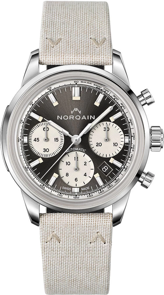 Norqain Watch Freedom 60 Chronograph Nortide Linen N2201S22C/T221/20INT.18S. The Adventure line embodies the thrill of exploring and conquering nature’s playground – the trails, the summits and the tides. The robustness of these powerful watches prepares them for whatever nature throws your way. The signature NORQAIN dial pattern, rotating bezels and uniquely sturdy construction make the NORQAIN Adventure timepieces equipped for a lifetime of adventurous moments. The Adventure collection has a strong character that speaks to sporty allrounders who are always on the search for a new challenge.