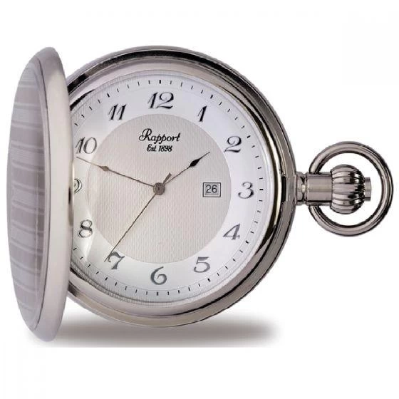 Rapport Pocket Watch Full Hunter Silver Tone PW71. Full Hunter Silver Pocket Watch. Arabic dial with raised silver figures. Date window Engraved Silver Tone, metal case.