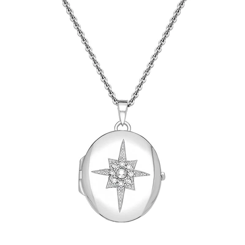 Sterling Silver Cubic Zirconia Star Centre Oval Keepsake Locket, P2630.