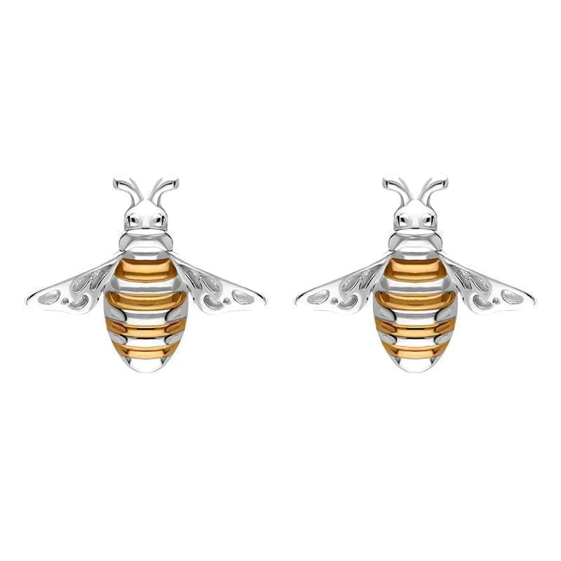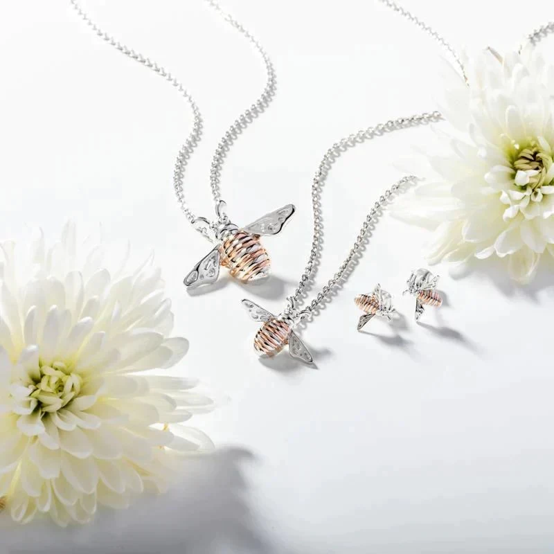 These lovely little striped bees are made using the highest quality solid sterling silver with rose gold plated detailing, creating a unique design that will appeal to nature and jewellery lovers alike. The set comprises a ring, a pair of stud earrings and necklace, complete with an 18 inch sterling silver chain. All items can be sold separately.