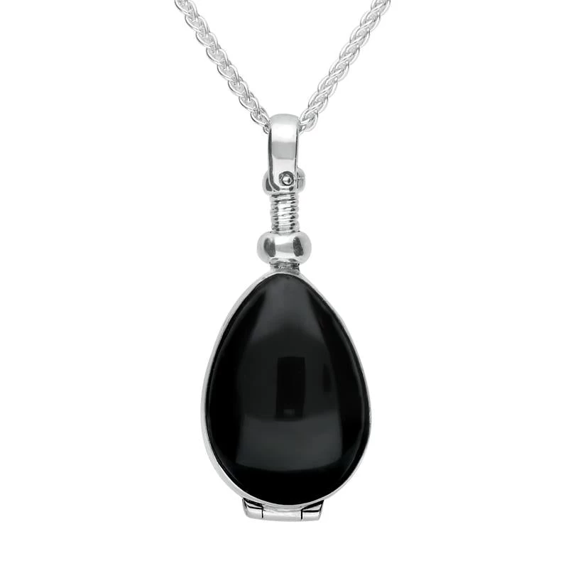 Sterling Silver Whitby Jet and Glass Pear Shaped Locket, P3298
