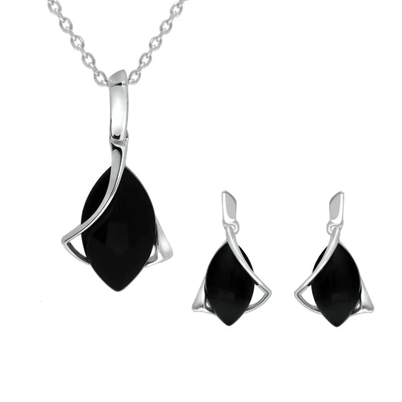 Sterling Silver Whitby Jet Marquise Centre Two Piece Set, S072