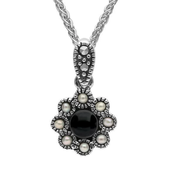 This beautiful sterling silver and Whitby Jet two piece set features a round Whitby Jet gemstone with eight pearls which are hand crafted in our workshop and set into the silver framework. Comprising of a pair of stud earrings and necklace, complete with an 18 inch sterling silver chain. All items can be sold separately.
