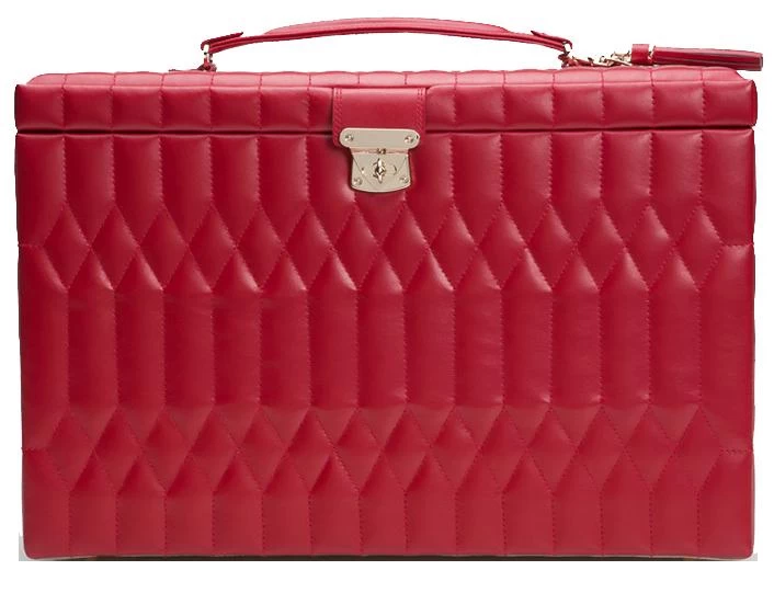 WOLF Jewellery Box Caroline Extra Large Red 329572. The Caroline is a signature WOLF jewellery case, defined by its distinctive quilted exterior and classic shape. Includes quilted red leather, leather tassel keyring, anti tarnish lustre lock lining, gold finished lock, glass mirror, 43 jewellery compartments, 4 watch compartments, 4 ring rolls, jewellery roll.