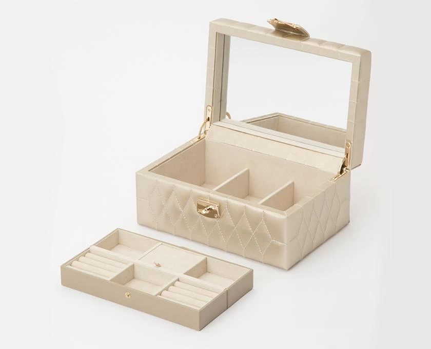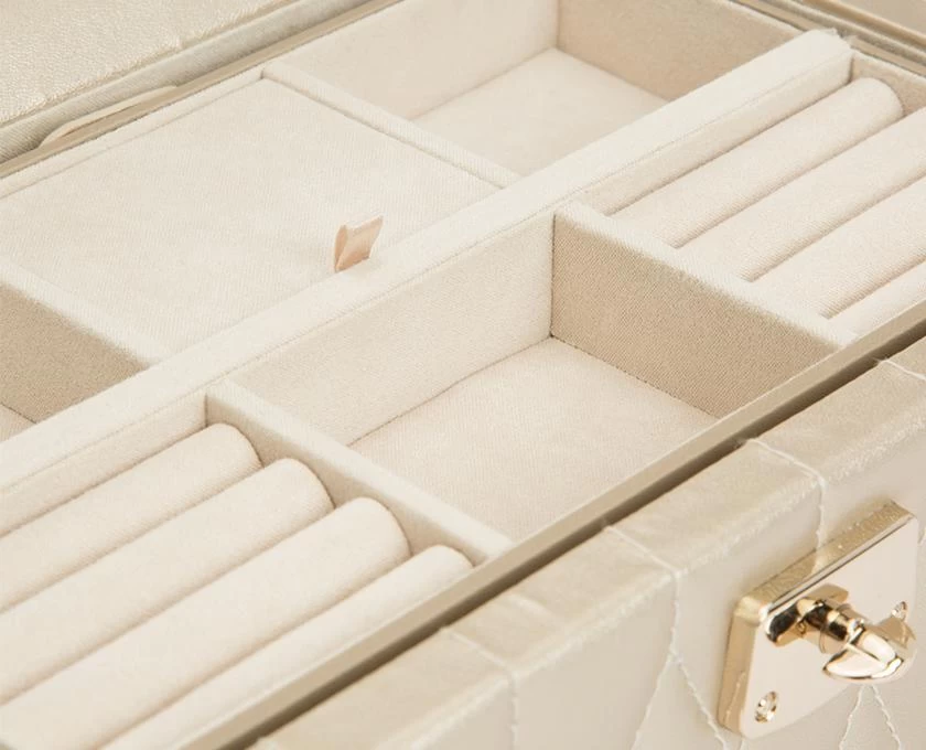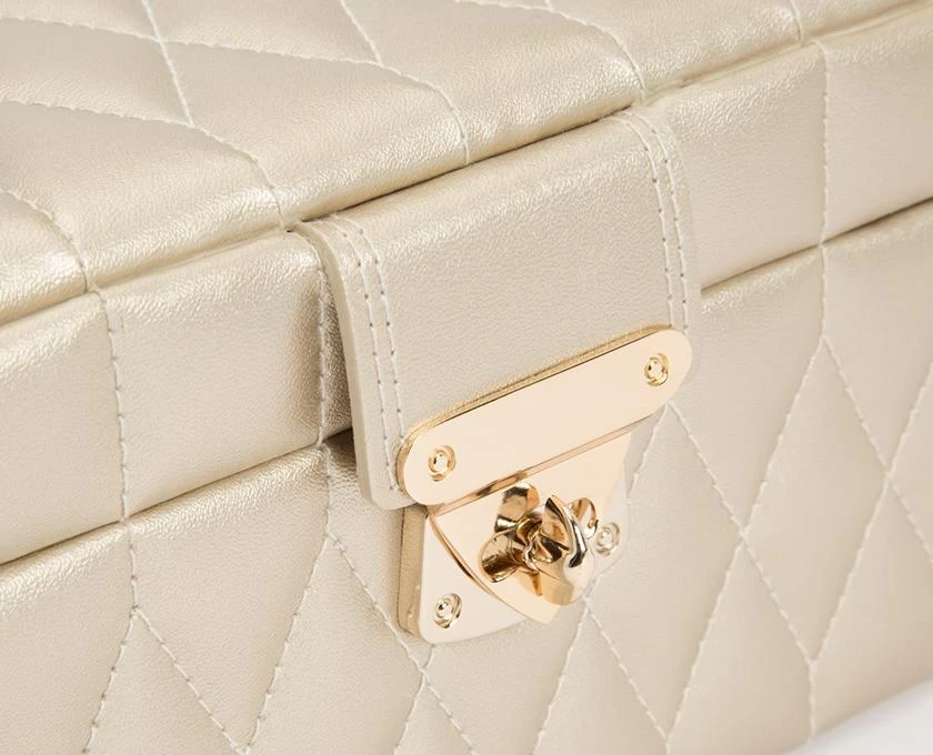 Wolf Jewellery Box Caroline Small Champagne 329846. The Caroline is a signature WOLF jewellery case, defined by its distinctive quilted exterior and classic shape. Includes quilted champagne leather, anti tarnish LustreLoc lining, gold finished lock, glass mirror, 3 compartments and travel case with 4 compartments and 6 ring rolls.