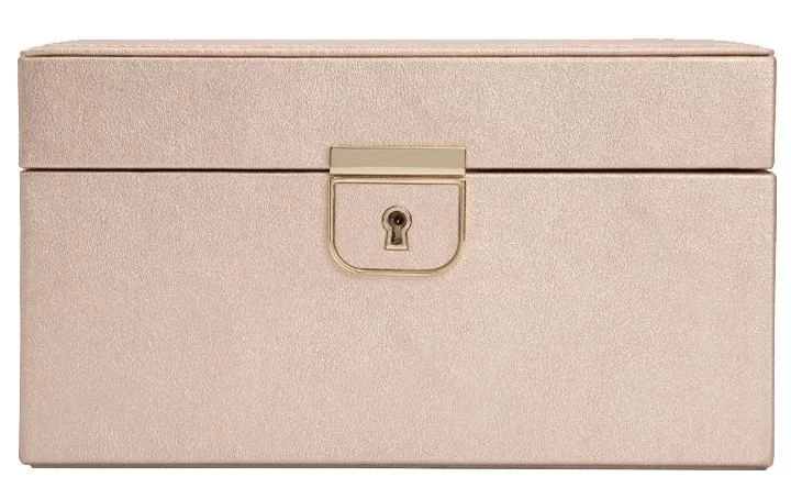 WOLF Jewellery Box Palermo Small Rose Gold 213116. A delicately constructed leather jewellery case, the Palermo collection represents a city synonymous with sophistication. Includes 1 ring roll, 4 storage compartments, glass mirror, top grain leather in rose gold, LustreLoc anti tarnish lining and lock and key with gold finish.