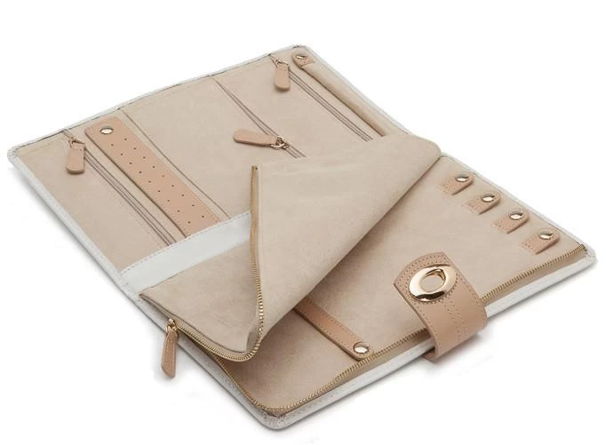 . A delicately constructed leather jewelry case, the Chloe accentuates the beauty of leather and pattern combined. Includes cream leather, gold finished hardware, LusterLoc anti tarnish lining, 1 ring roll, 3 storage compartments, 4 necklace holders and 18 earring holes.