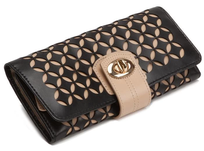 . A delicately constructed leather jewelry roll, the Chloe accentuates the beauty of leather and pattern combined. Includes black leather, gold finished hardware, LusterLoc anti tarnish lining, 2 ring holders, 8 earring holes and 4 storage compartments.